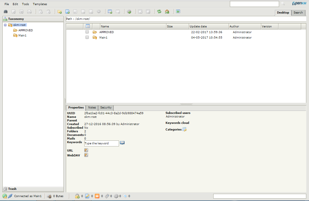 Forum rules: Please, before asking something see the documentation wiki or use the search feature of the forum. And remember we don't have a crystal ball or mental readers, so if you post about an issue tell us which OpenKM are you using and also the browser and operating system version. For more info read How to Report Bugs Effectively.